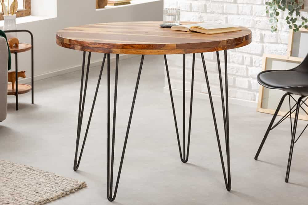 A dizájnos Elegant étkezőasztal belső terének igazi gyöngyszeme lesz. A hab a tortán kétségtelenül a nagy kerek asztallapja, amely szilárd indiai rózsafából (sheesham fa) készült. Új étkezőasztala által belső tere kifejezetten egyedi megjelenésű lesz. Négy retró stílusú fém láb biztosítja a biztonságot és a stabilitást minden felületen. Kombinálhatja az asztalt számos székkel, lámpával és komóddal - egyszerűen hagyja, hogy kreativitása vezesse. Ha inkább a természetes stílust kedveli, ez az asztal lesz a tökéletes kiegészítő az Ön számára.