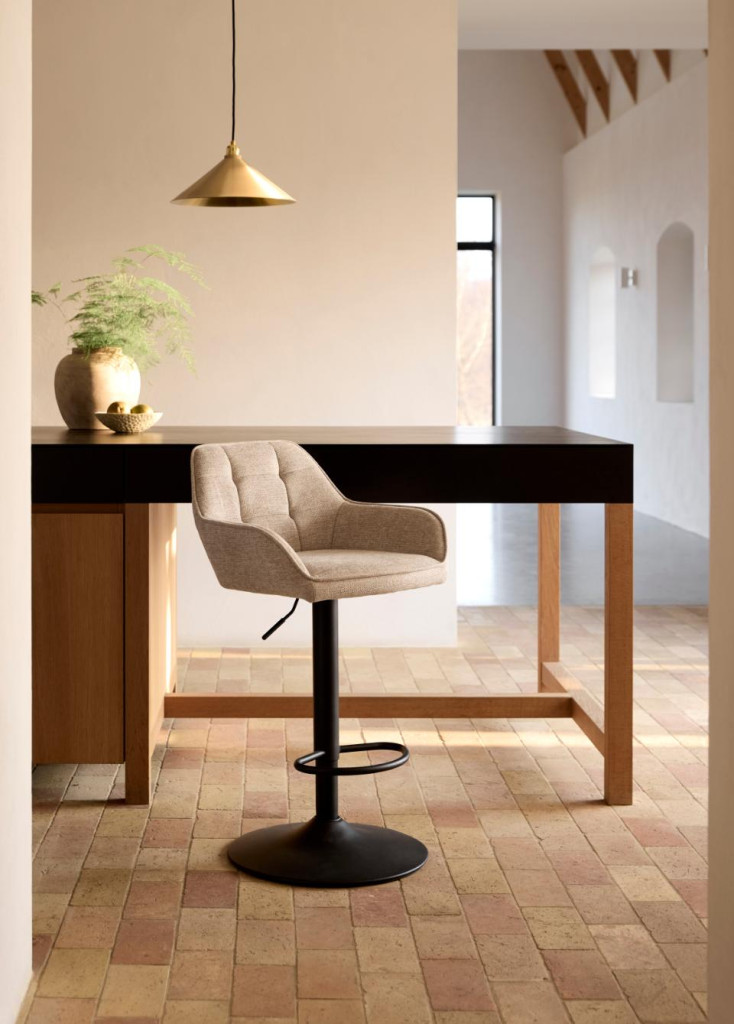 A Velian bárszék a modern letisztultság és a kényelmes elegancia találkozása. Lágyan ívelt formája és finom tapintású szövetkárpitja meleg, hívogató hangulatot teremt, míg a karcsú, fekete fém talp modern, mégis visszafogott karaktert ad a megjelenésnek. Az ergonomikus ülés és a kényelmes háttámla gondoskodik a pihentető üléspozícióról, legyen szó reggeli kávéról vagy egy esti beszélgetésről. A háttámlán található négyzetes díszvarrás finom részlet, amely elegáns, modern karaktert kölcsönöz a széknek. A 360°-ban forgatható ülőrész és a magasságállítás rugalmas használatot tesz lehetővé, így a Velian könnyedén alkalmazkodik bármely konyhaszigethez vagy bárpulthoz.