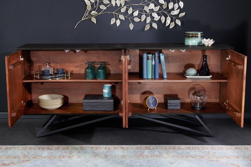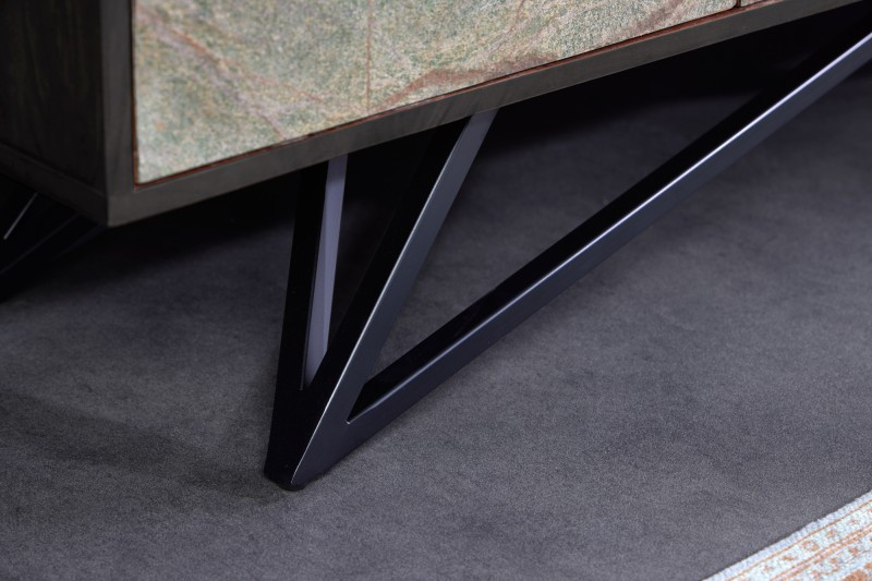 Engedd, hogy a Quillon komód elrepítsen India varázslatos hegyláncai közé, Rajasthanba, a királyok földjére! Ez a különleges bútor valódi terméskő-frontokkal készült, amelyek minden darabot megismételhetetlenné tesznek. A kőfurnér természetes erezete lenyűgöző látványt nyújt, és garantáltan otthonod központi elemévé válik. Az évmilliók alatt formálódott kőrétegek adják a komód páratlan karakterét, amely minden tekintetet magára vonz. A masszív akácfa korpusz modern fekete lakkozást kapott, amely elegánsan kiemeli a nyers kőfelület egyedi textúráját. Az absztrakt, fekete porfestett fém lábak tökéletes összhangban állnak a természetes anyagokkal, így a bútor egyszerre sugároz erőt és modern eleganciát. A tágas komód négy ajtóval és összesen négy rekesszel rendelkezik, így rengeteg helyet kínál a mindennapi tárgyaknak. A push-to-open rendszernek köszönhetően a fogantyú nélküli ajtók könnyedén nyithatók, miközben a frontok letisztult szépsége zavartalanul érvényesül. Ez a különleges bútor a természet erejét, az elegáns design-t és a funkcionalitást ötvözi, így igazi ékköve lesz otthonodnak.