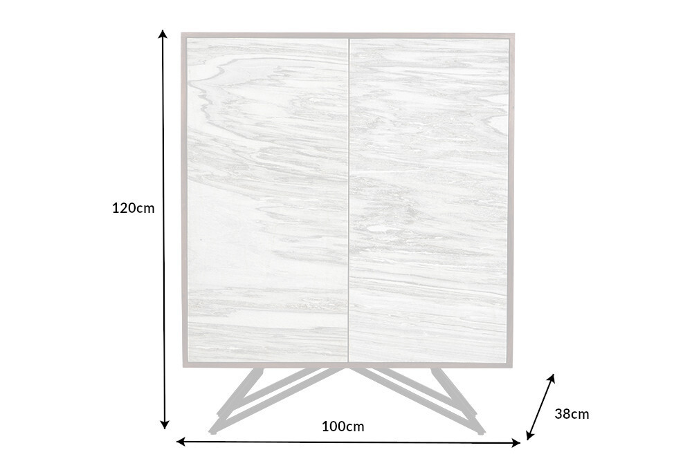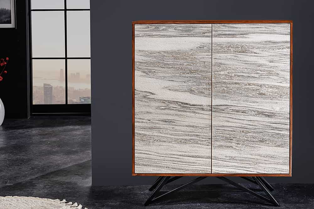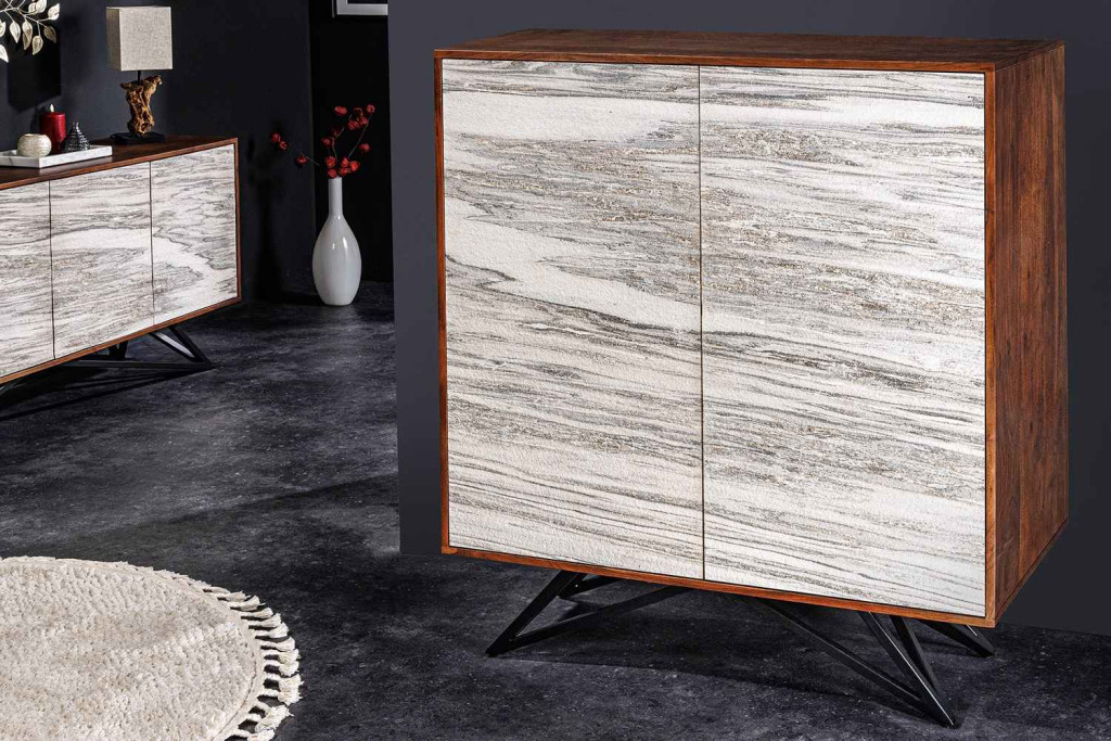 Design magas komód Quillon II 120 cm szürke fehér természetes kő