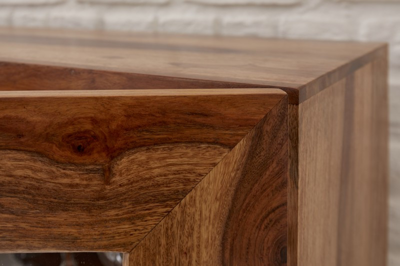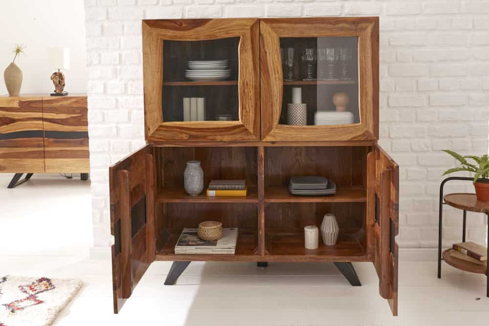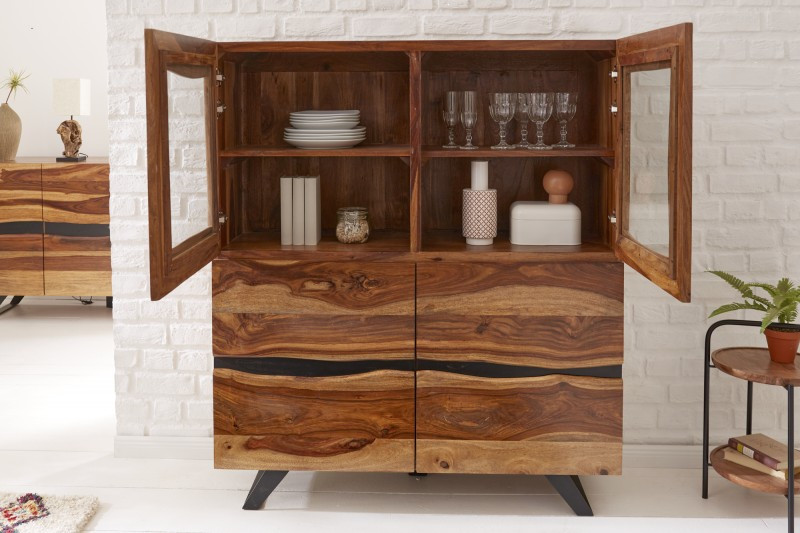 Olyan magas komódot keresel, amely bőséges tárolóhelyet kínál és egyedi megjelenésével is kiemelkedik? Ez az impozáns vitrines szekrény tömör sheesham fából készült és lenyűgöző designjával varázsolja különlegessé otthonodat. A bútor egyik legszebb részlete, hogy az éleket úgy munkálták meg, hogy azok egy sheesham fa eredeti karakterét és természetes benyomását idézzék. A fekete fém díszítés optikailag tagolja az ajtókat, és tökéletesen harmonizál a lábakkal – ez teszi a szekrényt igazán elegánssá. A komód felső négy rekesze az üvegajtóknak köszönhetően mindig látható – ide helyezheted az edényeket, poharakat vagy dekorációkat, amelyeket szívesen megmutatsz. A zárt ajtók mögött további négy tágas rekesz vár, így tárolóhelyből garantáltan nem lesz hiány. A komód különösen jól mutat, ha más bútorokkal kombinálod a sorozatból – próbáld ki, és teremts egységes, természetes hangulatot otthonodban! Méretek: 118cm x 138cm x 38cm (szélesség x magasság x mélység) Felső polcok: 4x 56cm x 27cm x 30cm (szélesség x magasság x mélység) Alsó, zárt polcok: 4x 56cm x 29cm x 35cm (szélesség x magasság x mélység) Szín: natúr barna, fekete Anyag: tömör fa sheesham, üveg, acél, lakkozott