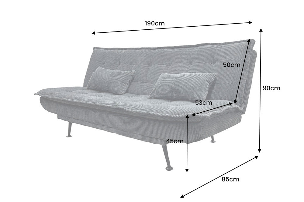 Méretek: 190cm x 90cm x 85cm (szélesség x magasság x mélység) Ülőfelület mérete: 190cm x 53cm (szélesség x mélység) Fekvőfelület mérete: 190cm x 110cm (szélesség x mélység) Ülőfelület magassága a földtől: 45cm Háttámla magassága: 50cm Párnák mérete: 2 x 55cm x 30cm (szélesség x magasság) Szín: szürke, fekete Anyag: kord (92% poliészter, 8% polyamide), fém, fa