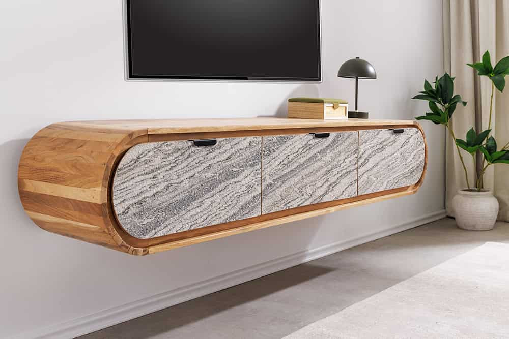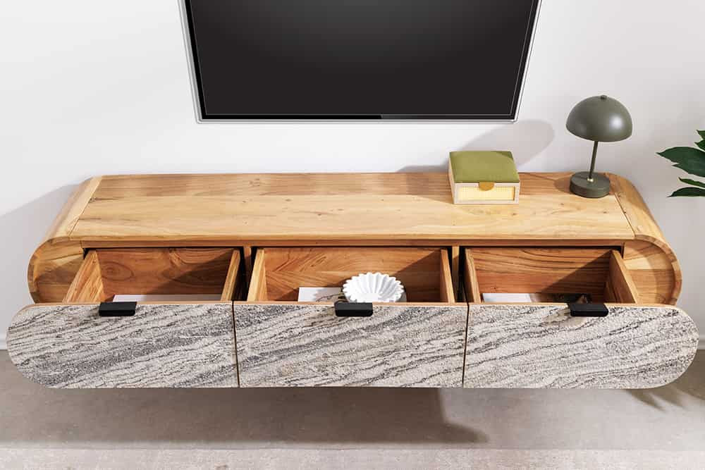 A Lorelei TV-állvány a kézműves minőséget különleges, természet ihlette dizájnnal ötvözi. Tömör akácfából és kőfurnér előlappal készült, finoman lekerekített éleivel és harmonikusan ívelt formájával a természet organikus vonalait idézi. A fa természetes erezete a sima felületkezelésnek köszönhetően gyönyörűen érvényesül, így minden darab egyedi megjelenést kap. A falra szerelhető, függesztett kialakítás könnyed, lebegő hatást kölcsönöz az állványnak, miközben modern és légies térérzetet teremt a nappaliban. A három tágas fiók bőséges tárolóhelyet biztosít műszaki eszközök, lemezek, DVD-k vagy lakáskiegészítők számára. A diszkrét fém fogantyúk modern hangsúlyt adnak, és tökéletes összhangban állnak a fa meleg tónusaival és a kőfurnér elegáns felületével. Legyen szó nappaliról vagy szórakoztatóelektronikai térről, a Lorelei TV-állvány a természetes esztétikát és a praktikus használhatóságot ötvözi, és stílusos alapot teremt otthonod berendezéséhez.