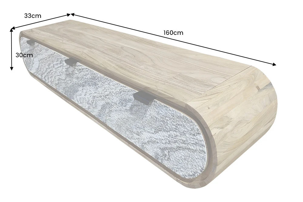 Méretek: 160cm x 30cm x 33cm (szélesség x magasság x mélység) Fiókok mérete: bal és jobb oldal: 33cm x 24cm x 15cm (szélesség x magasság x mélység) középső: 43cm x 24cm x 15cm (szélesség x magasság x mélység) Szín: natúr barna, szürke kő, fekete Anyag: akácfa, kőfurnér, fém
